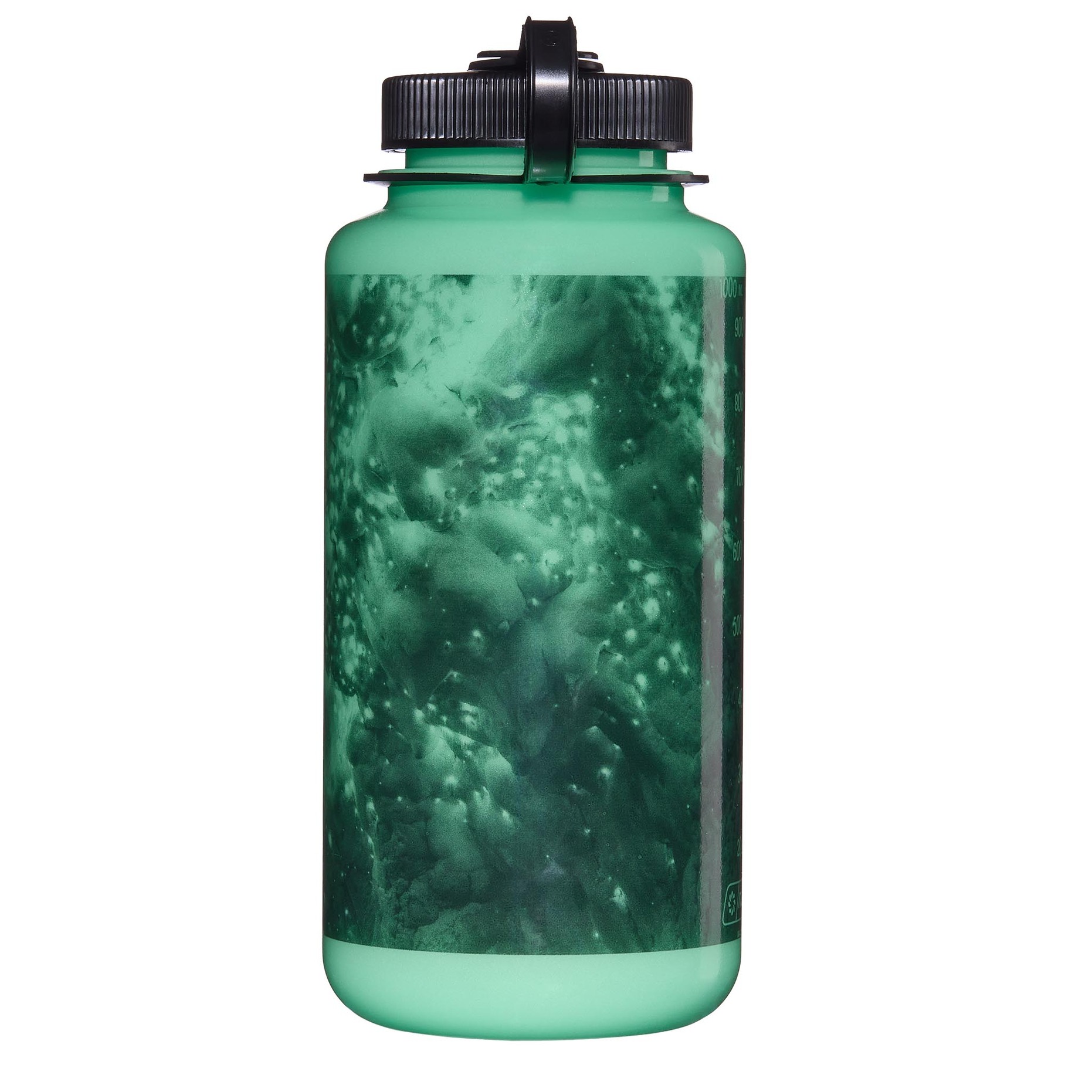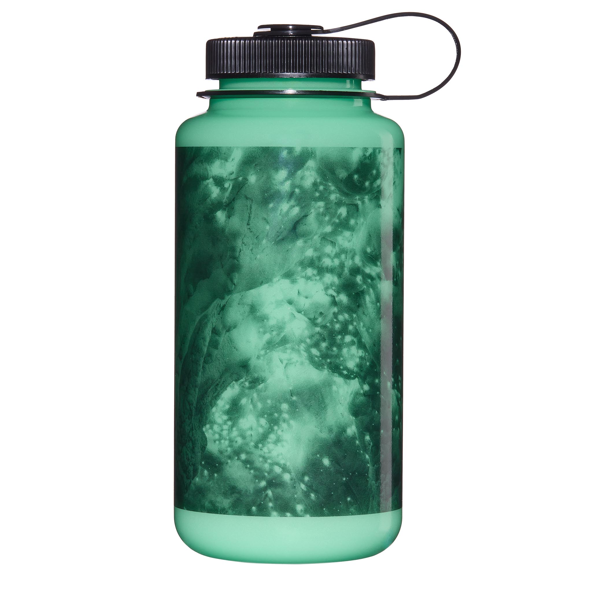 Nalgene GlowWyld is a 1L wide-mouth water bottle that glows in the dark. 50% post-consumer plastic (with ISCC certified mass balance). BPA/BPS free. Made in the USA. Leak-proof and dishwasher safe.