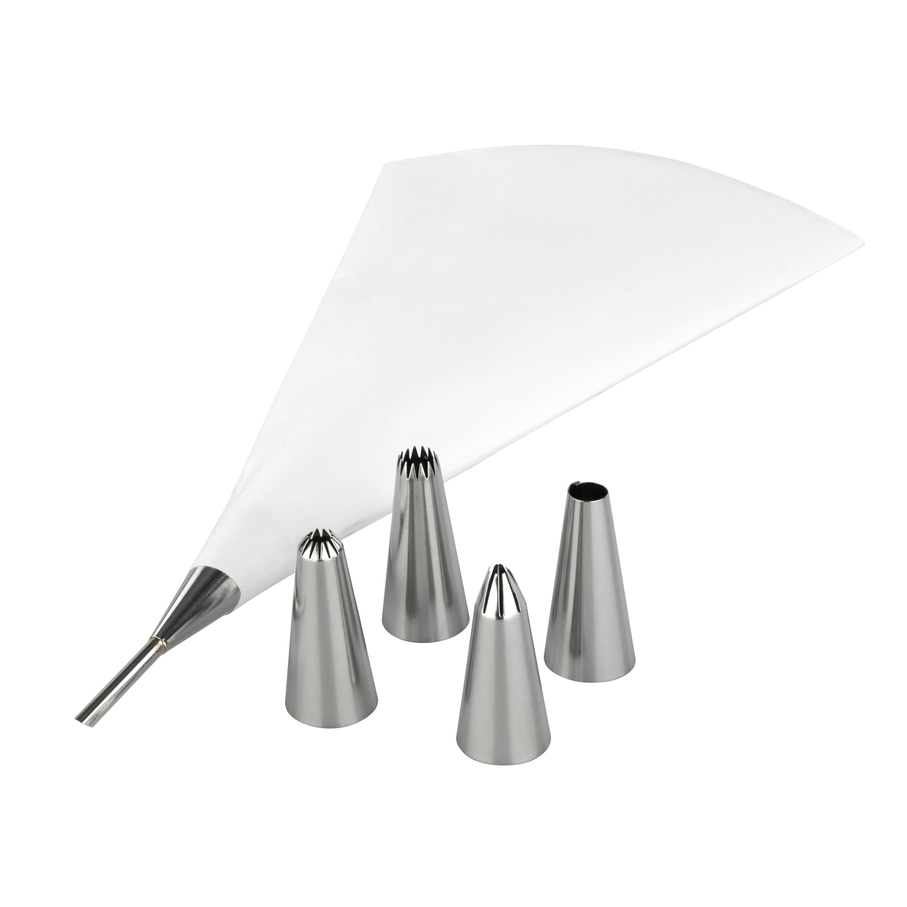 Tämä sarja sisältää laadukkaan 26 cm pursotuspussin, ruuviadapterin tyllan vaihdon helpottamiseksi ja 5 ruostumattomasta teräksestä valmistettua tyllaa, jotka kattavat valikoiman kuvioita.